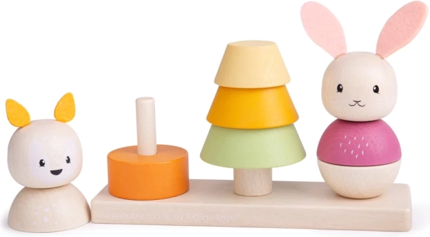 This high-quality BIGJIGS BABY wooden stacking toy offers plenty of fun and learning for children from 12 months. Three separate pegs with flexible joints allow easy and safe placement of the pieces: the fox and bunny stack on the side pegs, and a stylized pine tree on the middle peg. Pastel shades and pleasant shapes invite exploration, sorting, and building.