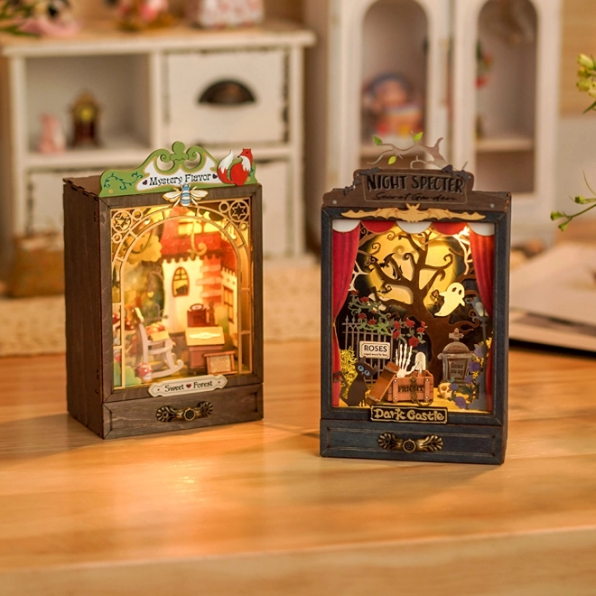 Prepare your stage and perform magical shows in the cabinet dioramas. This miniature theater comes equipped with warm LED lighting, which enhances the depth and atmosphere of your scene. Hidden sliding panels made of clear plastic protect your decoration from dust.