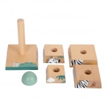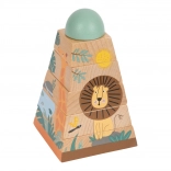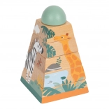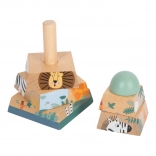 This wooden stacking tower is designed for developing children's fine motor skills and spatial awareness. By stacking colorful blocks, children discover friendly safari animals such as a giraffe, zebra, koala, and lion.