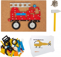 Comprehensive creative play set themed around transportation, including a cork base, wooden hammer, and many wooden pieces of different shapes and colors. Helps develop creativity, dexterity, and hand-eye coordination.