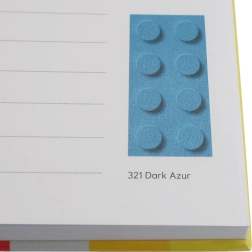 Each ruled page features an illustration of a brick in a specific LEGO shade to make writing more enjoyable and boost creativity.