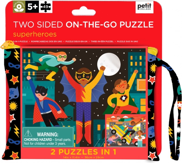 Discover the magic of the superhero world with this double-sided puzzle from Petit Collage. Every child can dive into an adventure that encourages shape and color recognition.