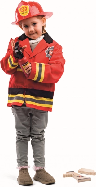 The set includes a wooden fire extinguisher, a walkie-talkie, and a megaphone—everything for authentic firefighting missions and endless stories.