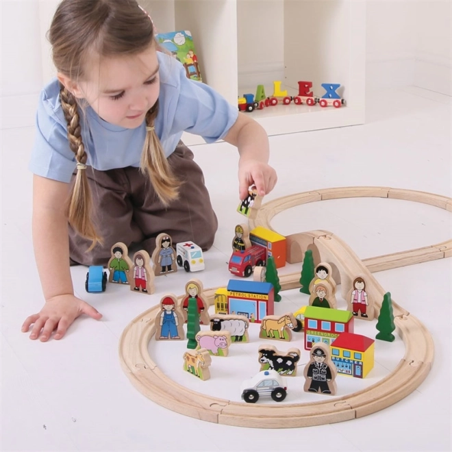 This rich set brings a bustling town and countryside to any children’s railway. It includes figures like a police officer and firefighter, useful vehicles including a car and fire engine, buildings, trees, and farm animals—all in durable wooden design with pleasant colors. Kids can create their own stories, stop trains, direct traffic, or care for the farm.