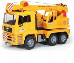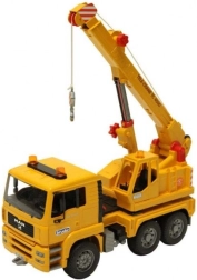 Detailed model for young builders: the BRUDER MAN TGA crane truck in 1:16 scale offers a 360° rotating crane with an extendable boom operated by a knob, a fully functional winch with release, soft treaded tires, and stabilizing outriggers. A tilting cab, folding mirrors, and a storage compartment complete the realistic design. Made in Germany from high-quality materials.