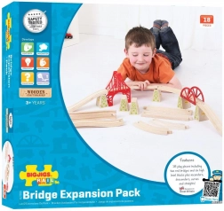 Expand your wooden railway with a universal bridge set with 18 pieces that adds new heights and adventures to play. The set includes ascending and descending tracks, supports, and bridge elements to easily overcome obstacles. It is fully compatible with most wooden railways and made from quality wood. Compatibility, quality materials, safe play, and development of imagination and fine motor skills.