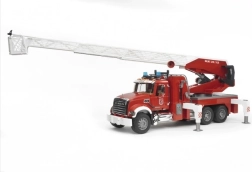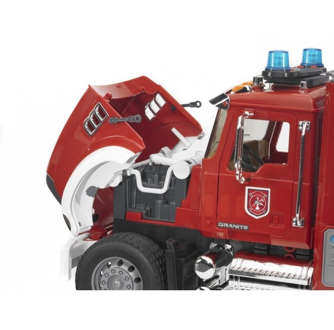 Experience action like real firefighters. This finely detailed BRUDER MACK Granite model offers a fully functional water pump and a ladder extendable up to 120 cm that rotates 360°. Stabilizing supports provide a firm base during “operations,” while the beacon with siren (BR2801) completes the authentic play experience.