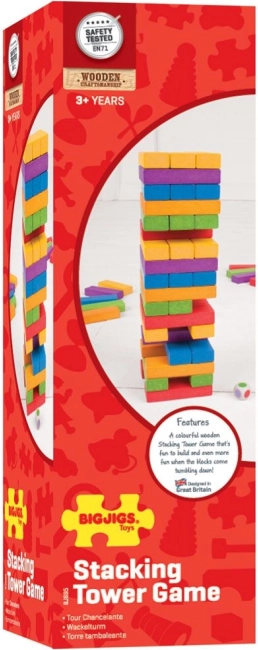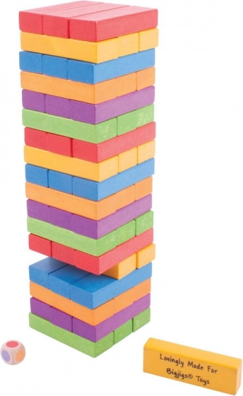 A fun and thrilling game for young and old where you try to pull out colored wooden pieces from the tower according to a dice roll—without making the tower fall. This colorful wooden tower develops patience, fine motor skills, and hand–eye coordination, while bringing hours of family fun.