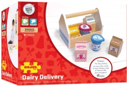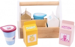 - Set includes: 4 drink cartons, yogurt, cream, wooden carry crate with handle