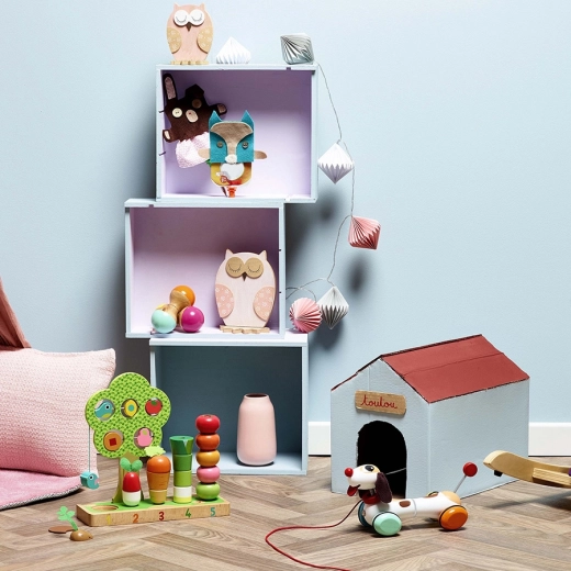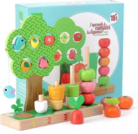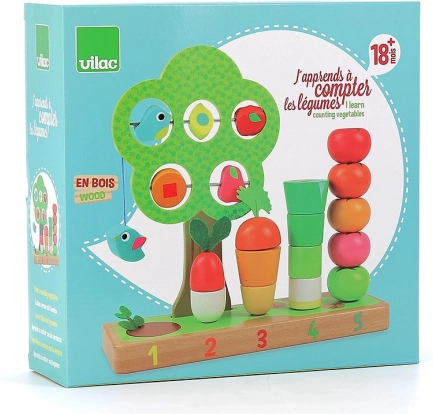 Discover the playful wooden set from Vilac that helps children learn to count, recognize colors and shapes, and at the same time practice fine motor skills. Colorful fruit and vegetable pieces are placed on numbered pegs, and beads move along the tree – the safe, durable design is ideal for children from 18 months.