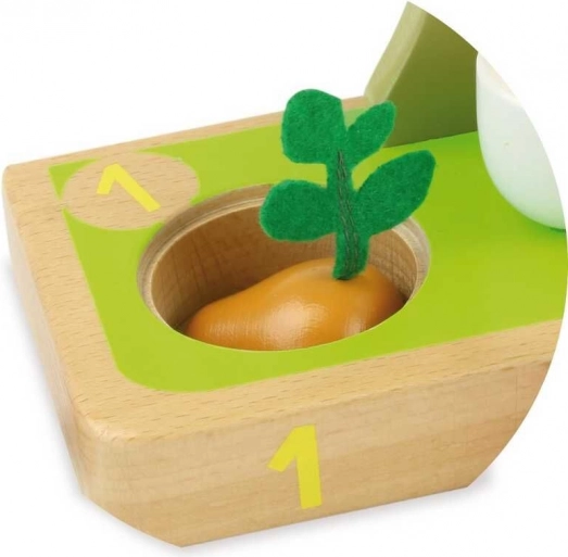 The numbered wooden base 1–5 teaches children to count and compare quantities. Stacking vegetables and shapes supports logical thinking and coordination.