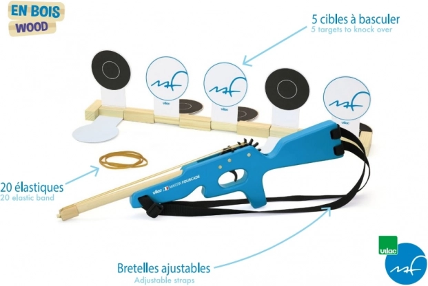 The wooden rifle is equipped with adjustable textile straps, ideal for every child. The package includes five folding targets and twenty rubber bands for repeated shooting. Try setting the targets at different distances and test your accuracy!