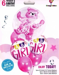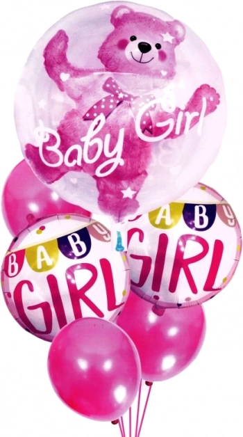 1× balloon with teddy bear and “Baby Girl” text, 2× balloon with garland and “Baby Girl” text, 3× solid pink balloons without print