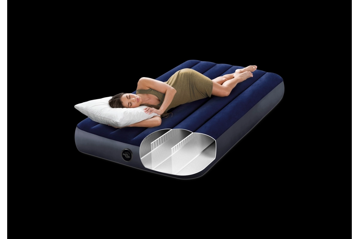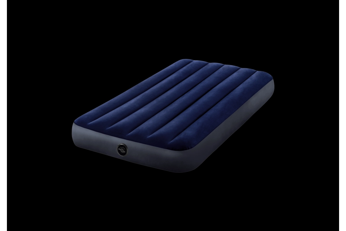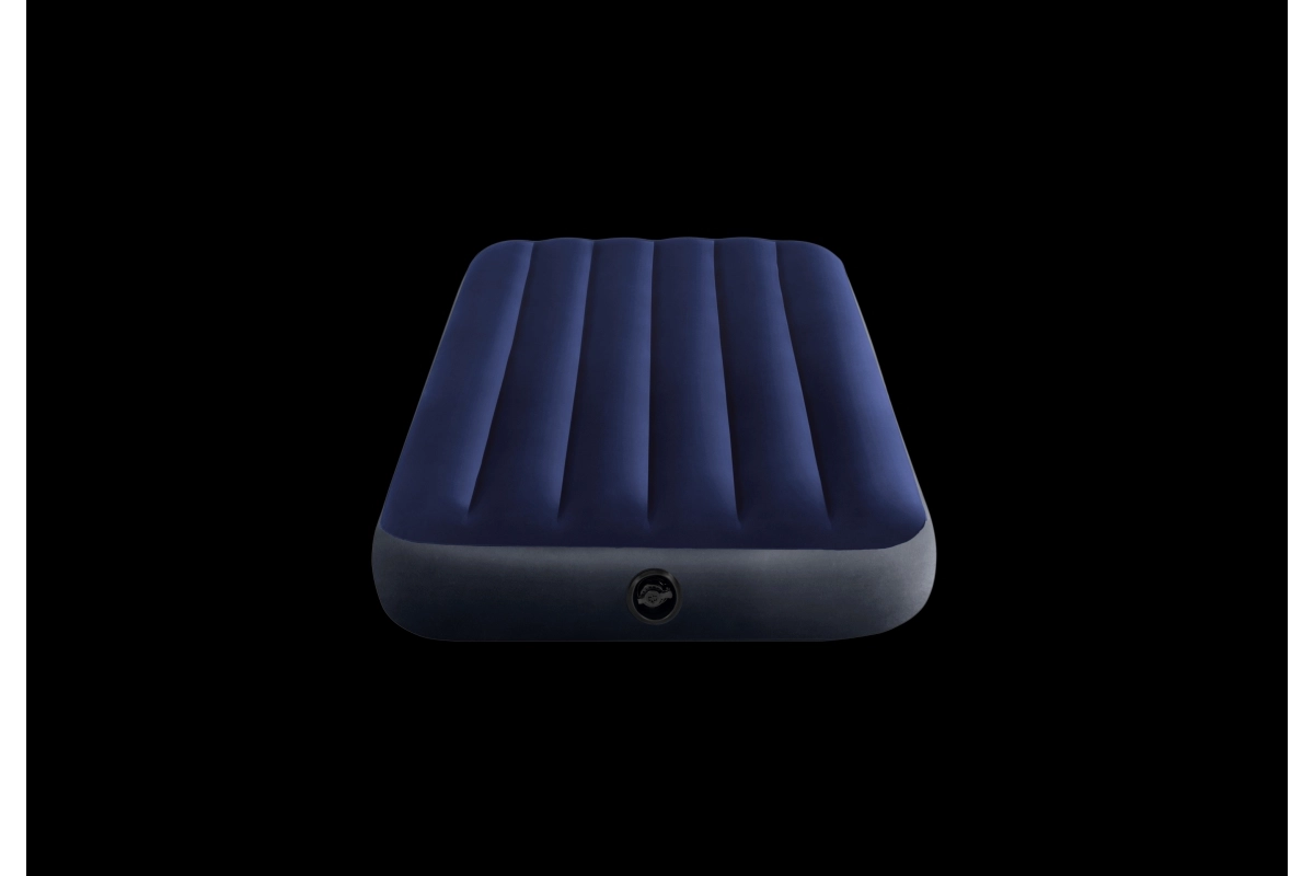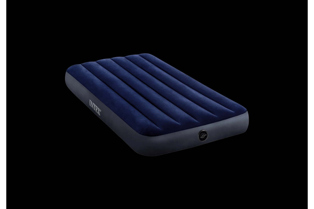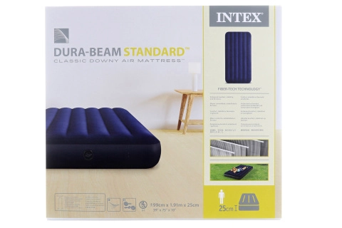 Practical single inflatable mattress measuring 191 × 99 × 25 cm from INTEX, ideal for home use and travel. Durable PVC with a velvety velour surface ensures a pleasant touch and better sheet grip, while Dura‑Beam Fiber technology provides stable support and long service life. An repair patch is included.