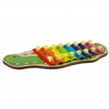 The xylophone combines wood and metal. A light tap of the mallet on a bar produces a clear tone, with volume depending on the strength of the strike. The vivid, warm colors invite play and are great for learning colors.