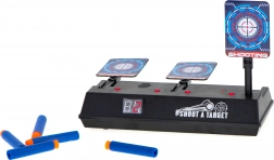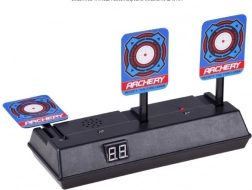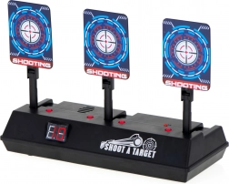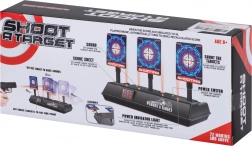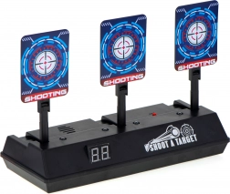 The target can be used with foam dart guns and provides a realistic experience thanks to sound and light effects. Upon impact, you'll hear shattering glass or applause sounds. The target is equipped with a digital counter that records scores. It resets automatically after hitting all three targets.