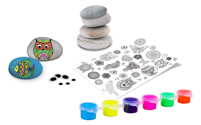 4 stones, 6 neon paints, 1 brush, 1 wooden stick, 1 sheet of transfer stickers, a bag with adhesive eyes and beads