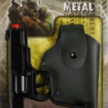 The package includes a quality black leather holster with metal studs for reinforcement and a button fastening for secure weapon attachment.