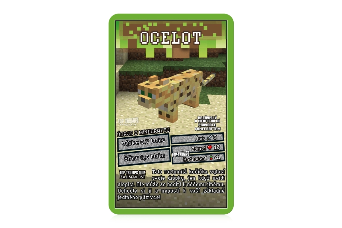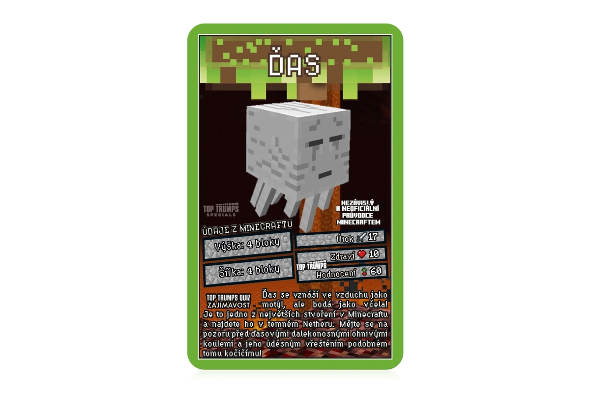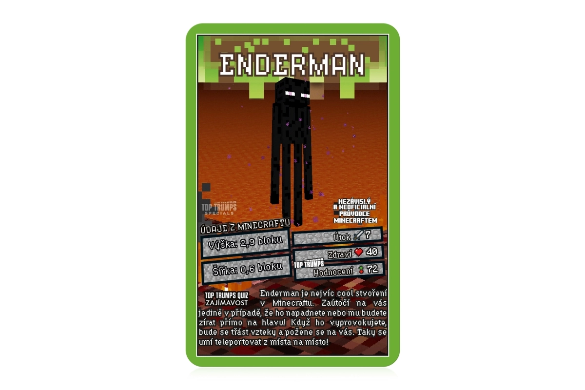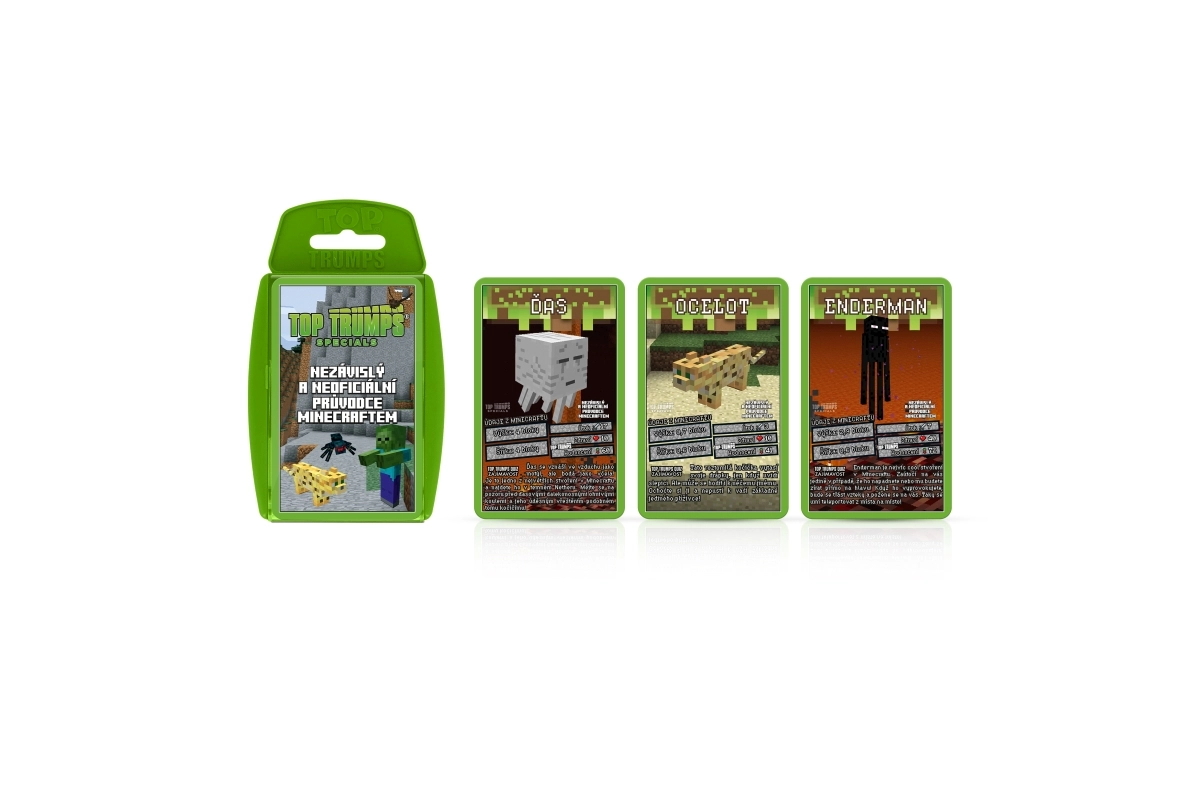Discover the world of MINECRAFT in the legendary Top Trumps game. Each card features favorite characters and creatures from the game, their health, attack power, and other values. Choose the right attribute, defeat your opponent, and win their cards. The goal is to collect the entire deck and become the ultimate champion.
