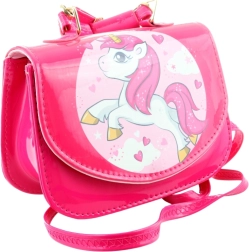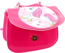 This pink handbag with a cute unicorn is a perfect accessory for everyday wear and special occasions. Its shiny surface, gold-tone metal details, and playful print make it a stylish piece kids love.