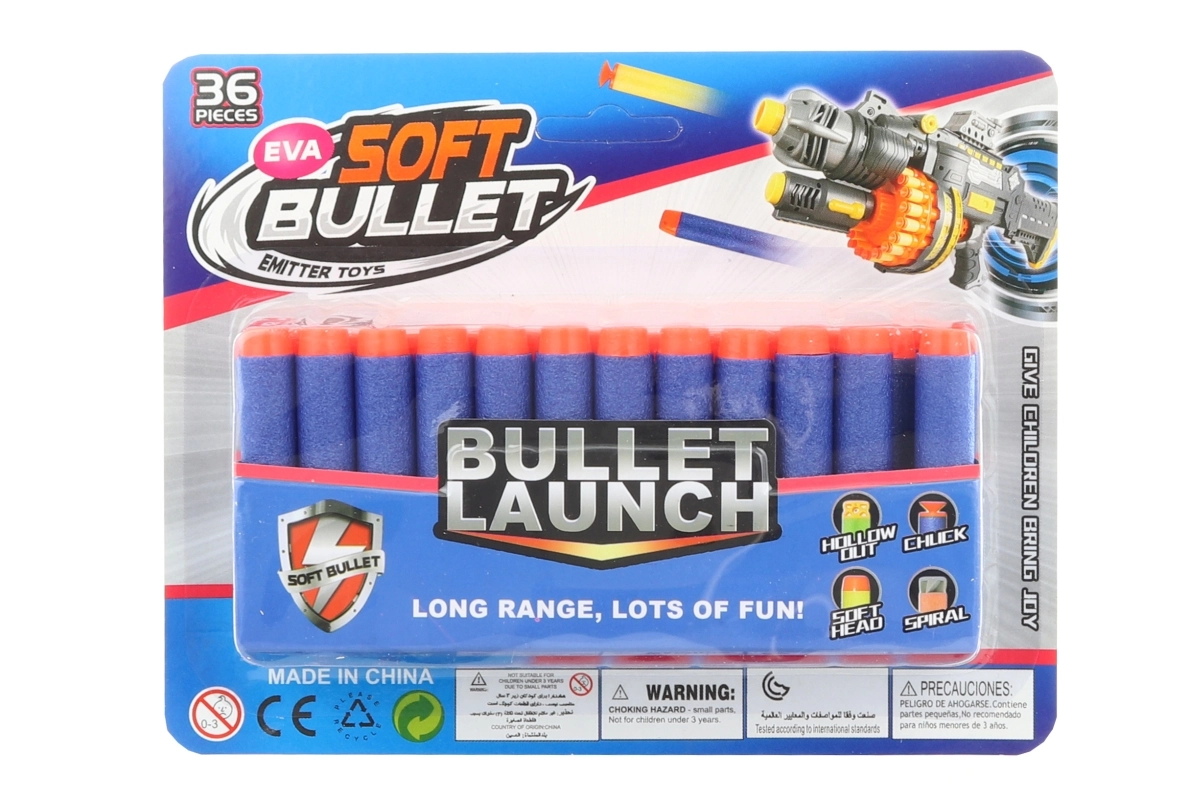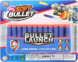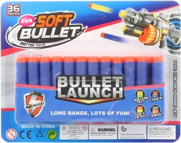 A set of replacement foam darts with soft tips, ideal for safe and fun play. The pack includes 36 pieces of standard darts measuring 7 × 1.3 cm, suitable for most common blasters. The soft tip ensures a safer impact and long durability with frequent use. Recommended for children aged 8+.