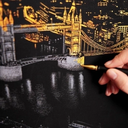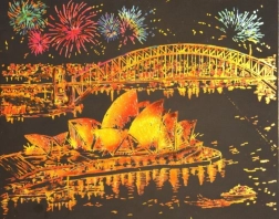 Discover the magic of scratch art: beneath the black layer lies a gold base that turns every scratched stroke into a contrasting, elegant effect. The iconic Sydney Opera House in a night scene will delight both beginners and advanced creators, and the finished picture will make a unique decoration.