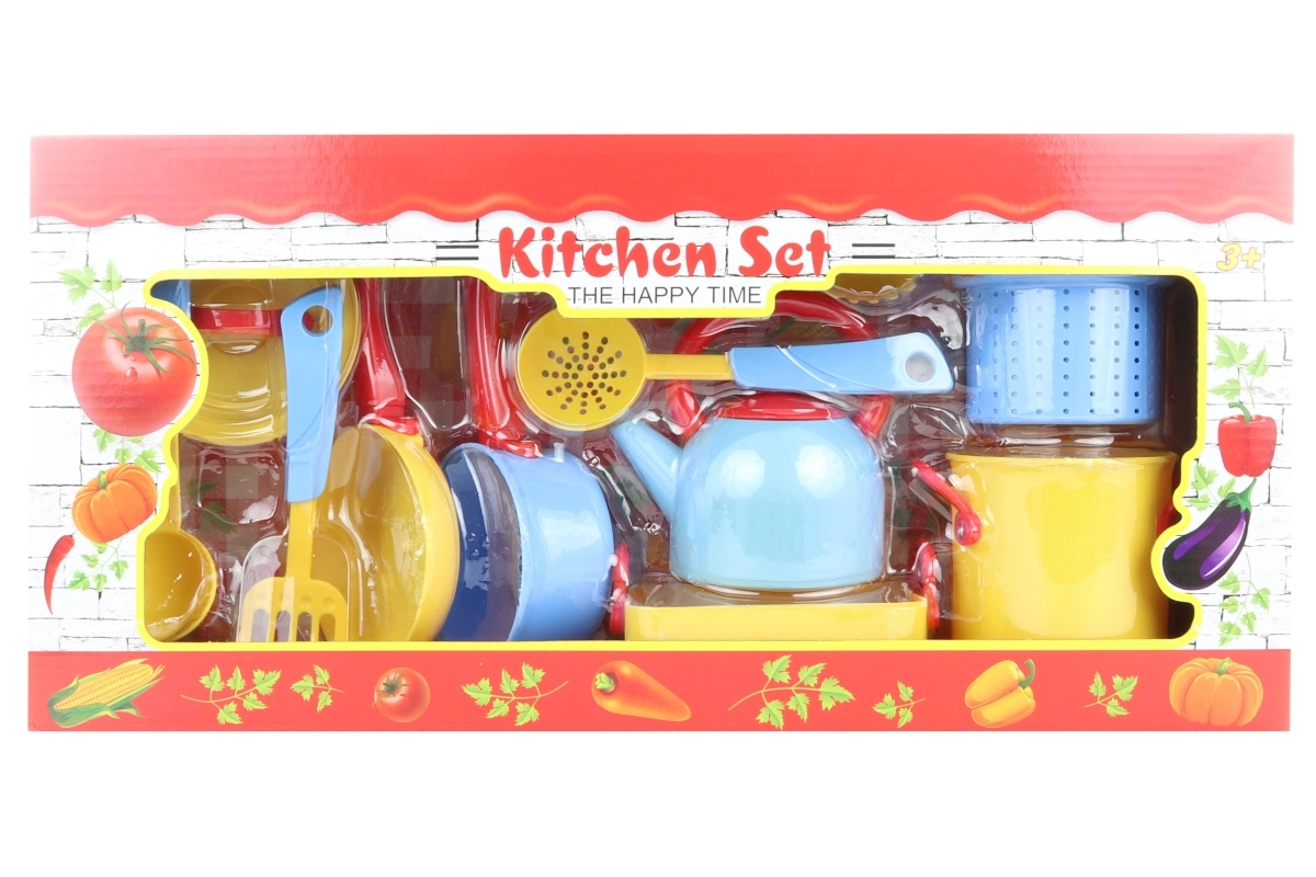 The set includes a kettle, pot, strainer, saucepan, frying pan, lid, and additional accessories to support creative play and the development of fine motor skills. Ideal for children aged 3 and up.