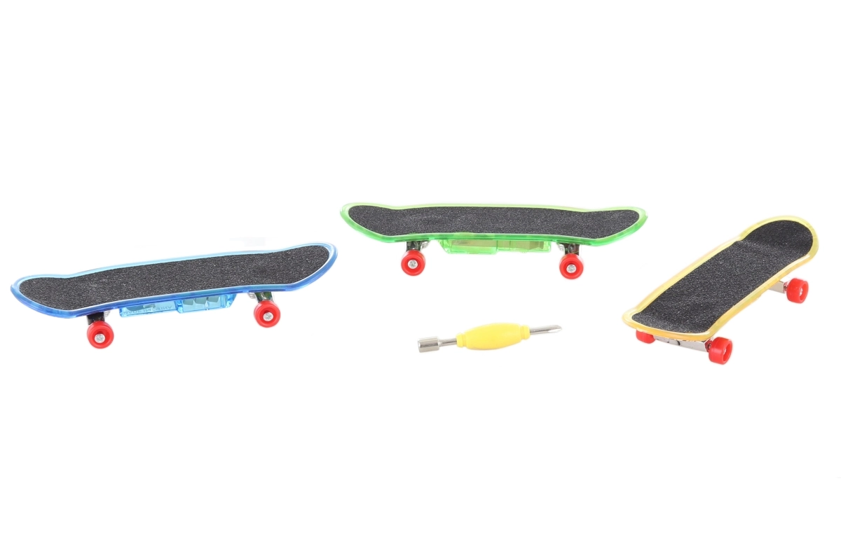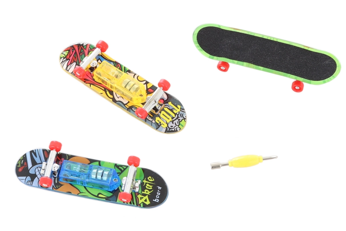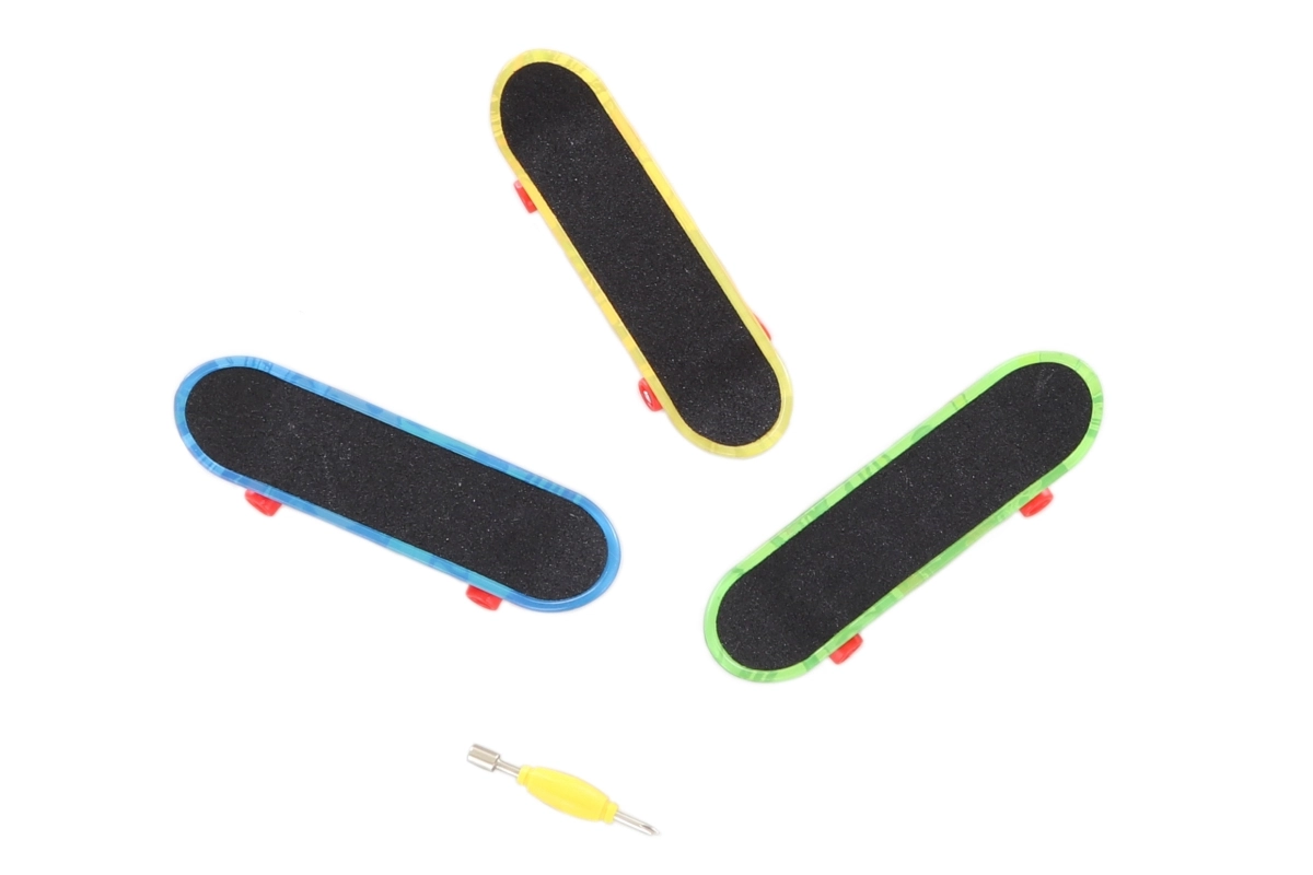 The box includes 3 mini skateboards and a tool for screwing. AG13 batteries are included, so you can start right away.