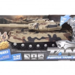 A beige battery-powered children's tank will delight young technology enthusiasts. Thanks to the flywheel, it starts easily, has compact dimensions, and is suitable for children from 3 years.