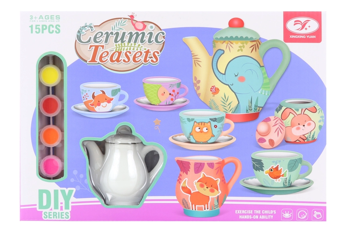 • Complete kit – 4 cups with saucers, teapot, milk jug, sugar bowl, 6 paints, and a brush.