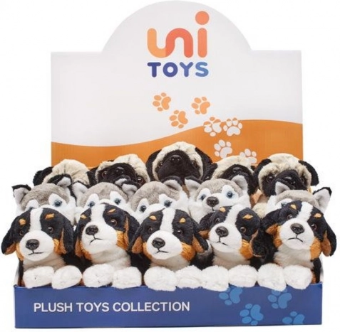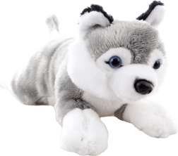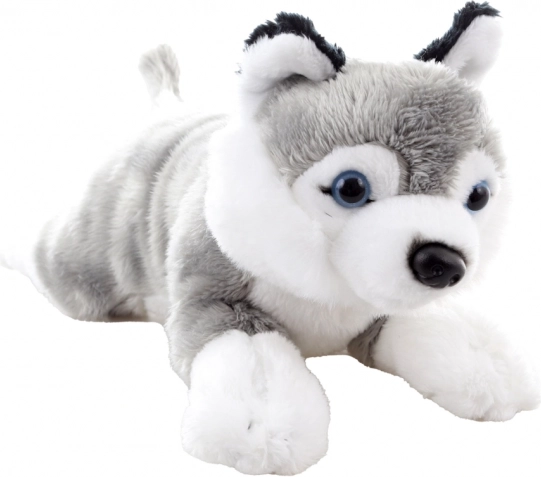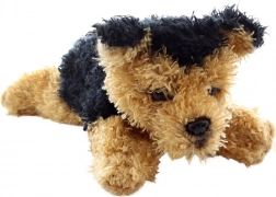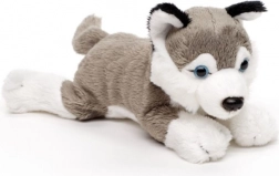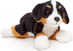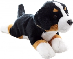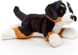 A cute plush puppy in a lying position, 19 cm in size, ideal for cuddling and as a first toy for the youngest. It has super-soft, velvety fur, safe design for age 0+, and compact dimensions that fit little hands.