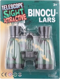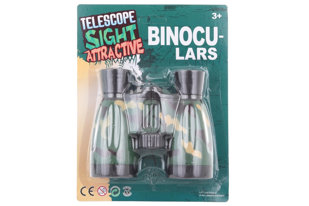 Plastic camouflage binoculars measuring approximately 13.5 x 12 x 5 cm. Package dimensions approximately 17 x 22 x 5.5 cm. Age 3+