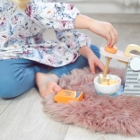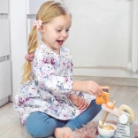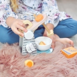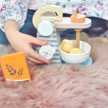 This pink-gray mixer with a tilting arm and stylish design elements allows children to simulate cooking skills in role-playing. The mixer has a convenient handle, so children can easily insert or remove the bowl, enhancing their motor skills.