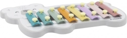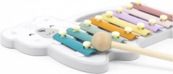 The wooden xylophone in the shape of a polar bear combines playful aesthetics with a functional musical instrument. Pastel-colored metal bars produce pleasant tones when struck with the wooden mallet, naturally motivating children to experiment with sounds and rhythm.