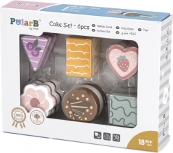 This set includes six beautifully crafted wooden pastries in various shapes and colors — cake slices, a round piece, a heart, and a bar. Children can play patisserie, serve a teddy, or host a tea party. Each piece fits well in small hands and invites repeat play.