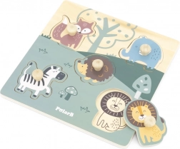 The PolarB wooden puzzle combines quality materials and thoughtful design for little explorers. Each piece has a wooden knob for easy grasping by small fingers and precise placement into the matching cutout. Under each shape on the board there is a drawn animal picture that guides and motivates children to keep puzzling.