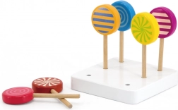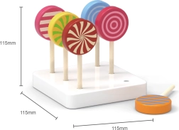 The set contains six wooden lollipops seated on a white base, which help to improve motor skills and visual recognition.
