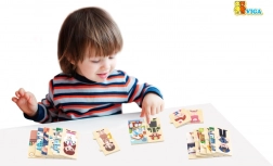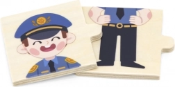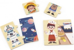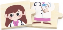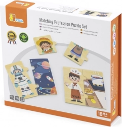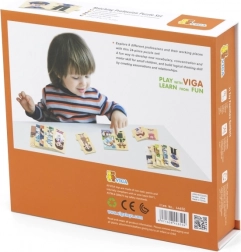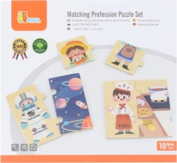 This educational wooden game by VIGA introduces children to various professions—from doctor and firefighter to chef and astronaut. Each profession consists of three parts: two for the character and one larger piece for the workplace. Children first match the correct pair and then connect it with the environment.