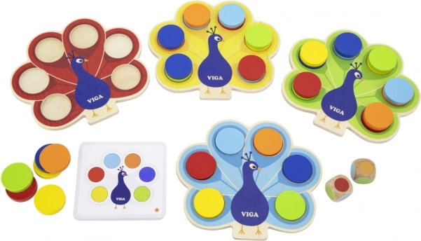 The set includes 4× wooden peacock boards, 36 discs in 6 colors, 20 double-sided task cards, and 2 color dice. The game supports both solo and team activities and is an excellent preparation for preschool education.