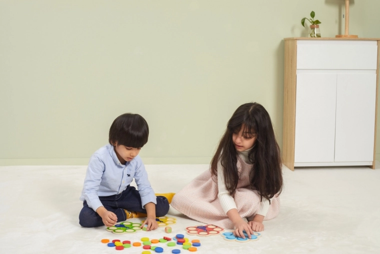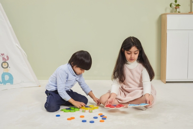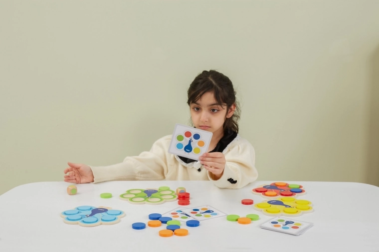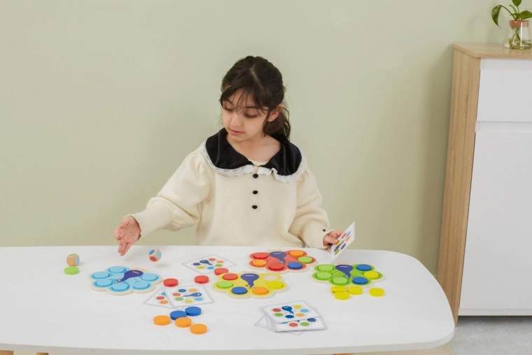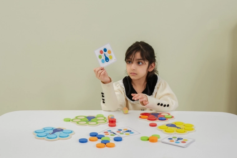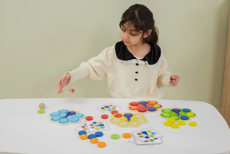 Children match discs based on cards or die rolls, naturally mastering colors while training attention and logic.