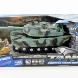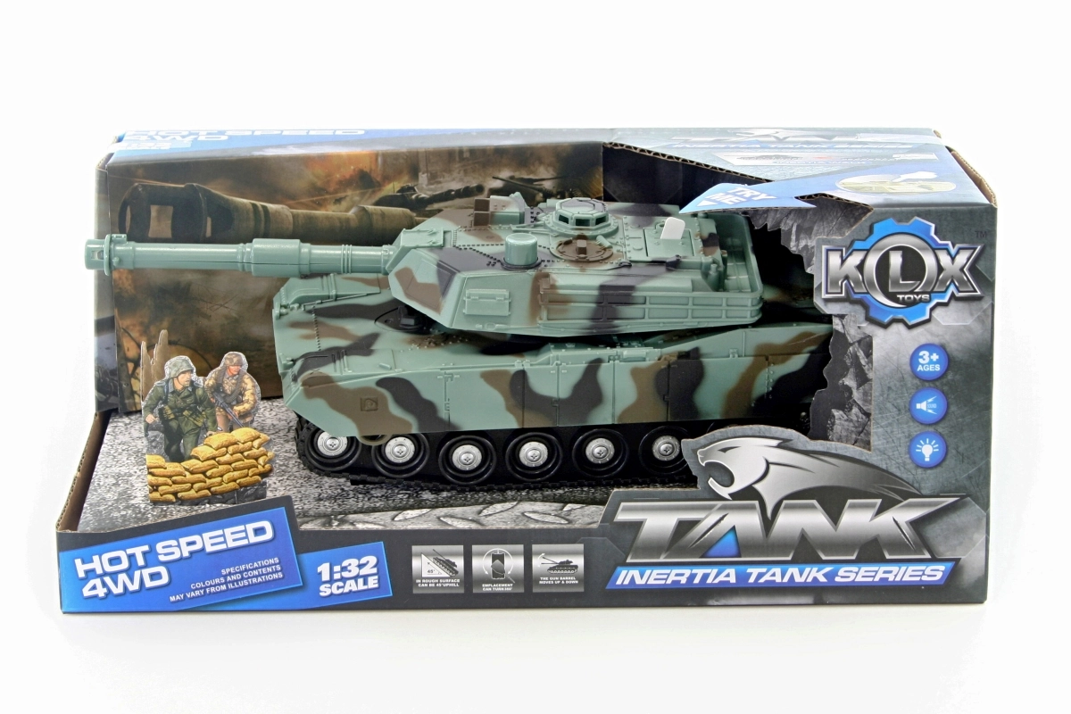 A fun tank for kids aged 3+ with dark camouflage featuring a shooting sound, light-up cannon, and a rotating barrel in all directions. Movement is powered by a flywheel, power supply 3× AG13 (batteries included). Scale 1:32, dimensions approx. 22 × 8 cm.