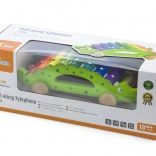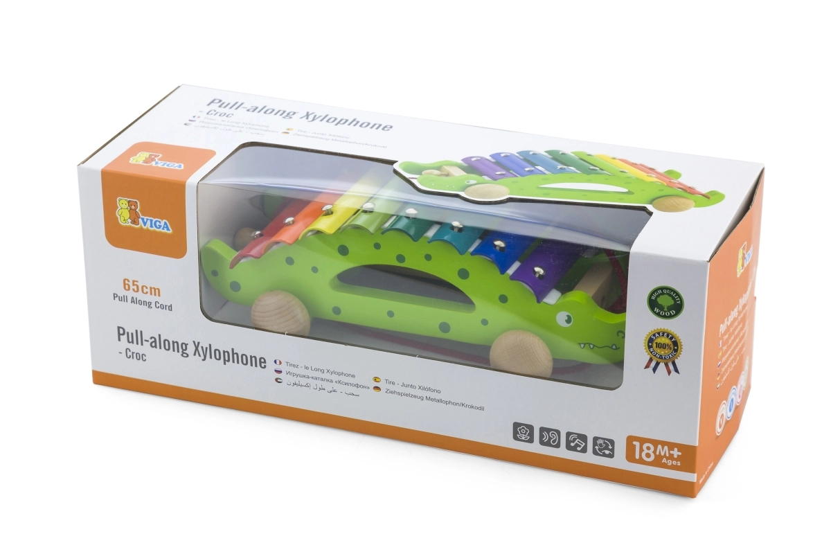 Colorful xylophone keys invite children to explore sounds and learn rhythm, while the crocodile rolls along on wheels behind them.