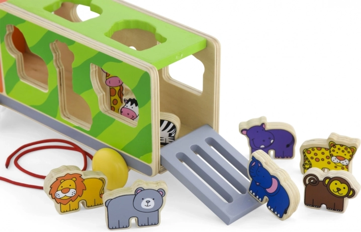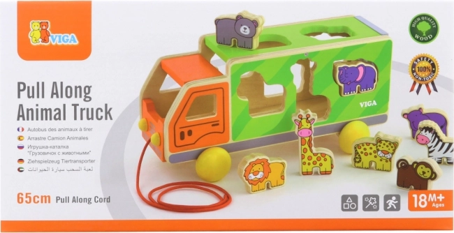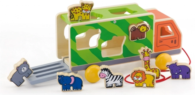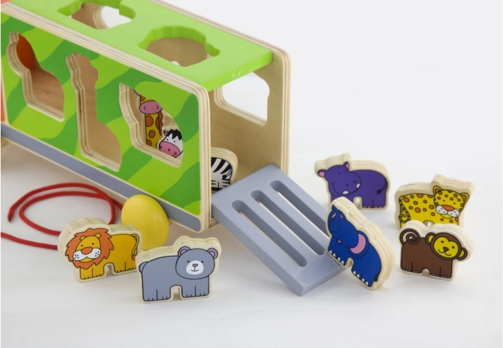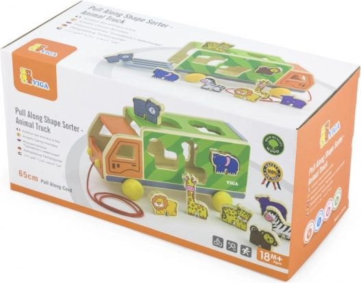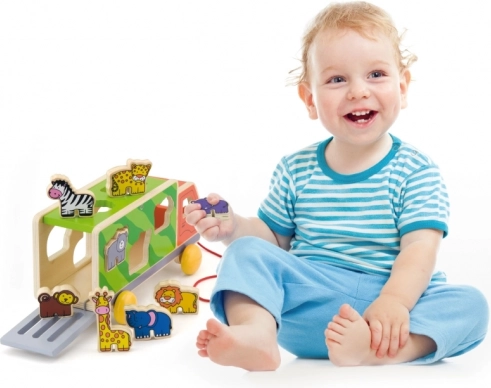 The truck can be pulled by a cord and also serves as a smart shape sorter. Children engage movement and logical thinking while finding the correct openings for the animals.