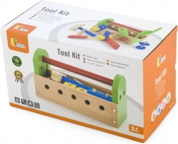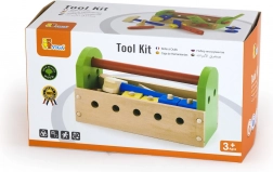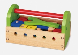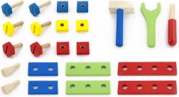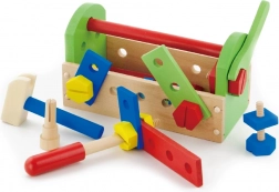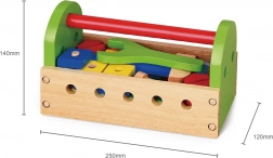 A fun and safe wooden tool set for little DIYers aged 3+ in a practical carrier. Includes a screwdriver, hammer, wrench and colorful screws, nuts, and plates for screwing. Supports fine motor skills, coordination, and imagination thanks to quality wooden construction.