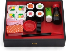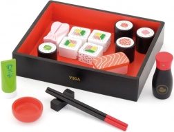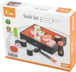 The set includes various wooden pieces of sushi, chopsticks, a soy sauce container, and a serving tray, perfectly mimicking the authentic sushi serving experience. It's an excellent way to introduce children to different types of food and teach them the basic skills of Japanese cuisine.