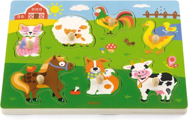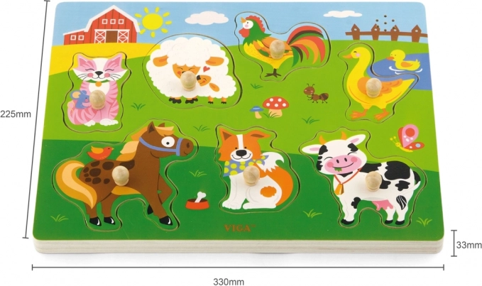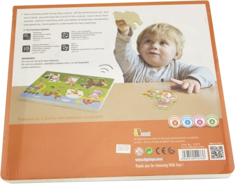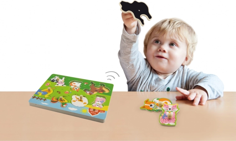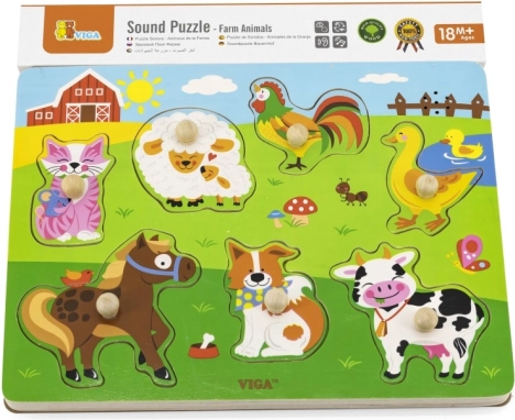 Discover the Wooden Sound Puzzle with farm animals, designed for kids 18 months and older. Features sounds, easy-grasp knobs, and durable wooden construction to enhance motor skills and learning.