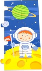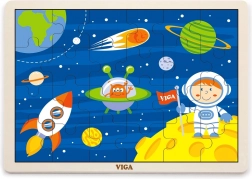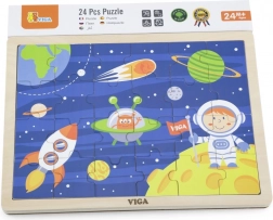 The VIGA wooden puzzle with a space theme brings young children the joy of discovery. Colorful illustrations with a rocket, astronaut, and planets naturally support shape and color recognition and the development of hand–eye coordination. The completed puzzle measures approximately 27.5 × 20 cm, so it fits perfectly on a table or in a kids’ corner.