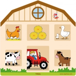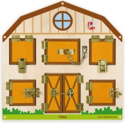 This quality wooden toy in the shape of a little house offers several doors with different types of locks — hooks, hasps, chains, and sliding latches. With every opening, a surprise awaits in the form of illustrated animals, encouraging curiosity, focus, and hand–eye coordination.