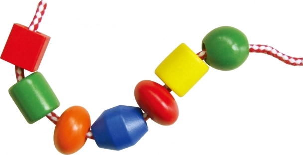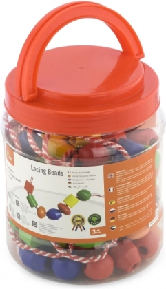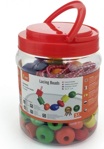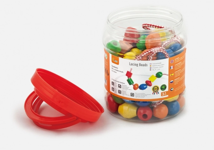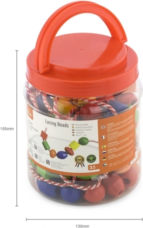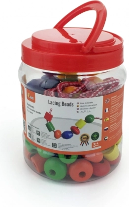 A plastic jar contains large wooden beads and colorful laces on which the beads can be strung. Bead size approx. 2 x 2 cm depending on the type. Package dimensions approx. 16 x 12 cm. Contains 90 beads and 5 strings. Age 3+.
