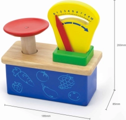 The scale measures approx. 18.5 × 20 × 8.5 cm, sits comfortably in little hands, and is made from a combination of wood and durable plastic. Safe for children aged 3+, it supports imagination, fine motor skills, and social development.